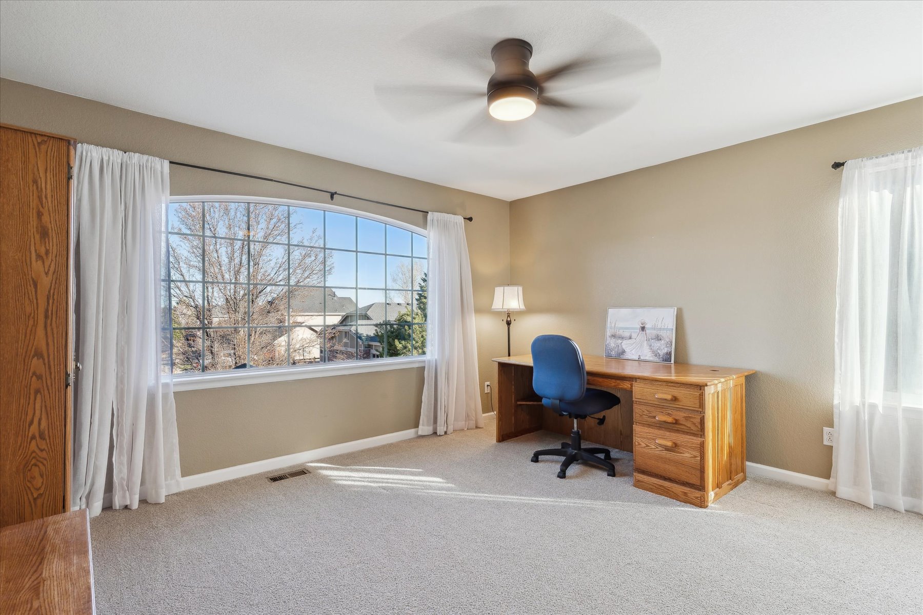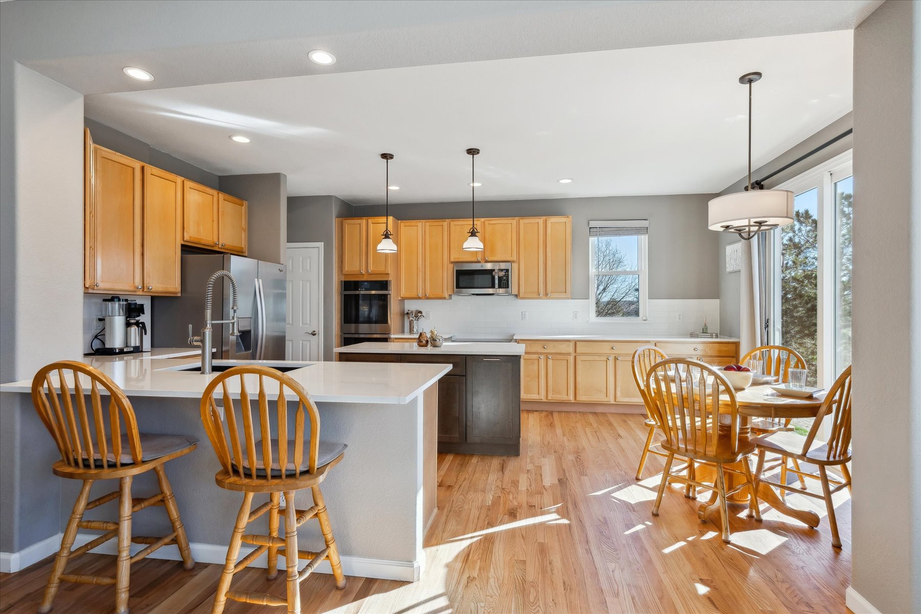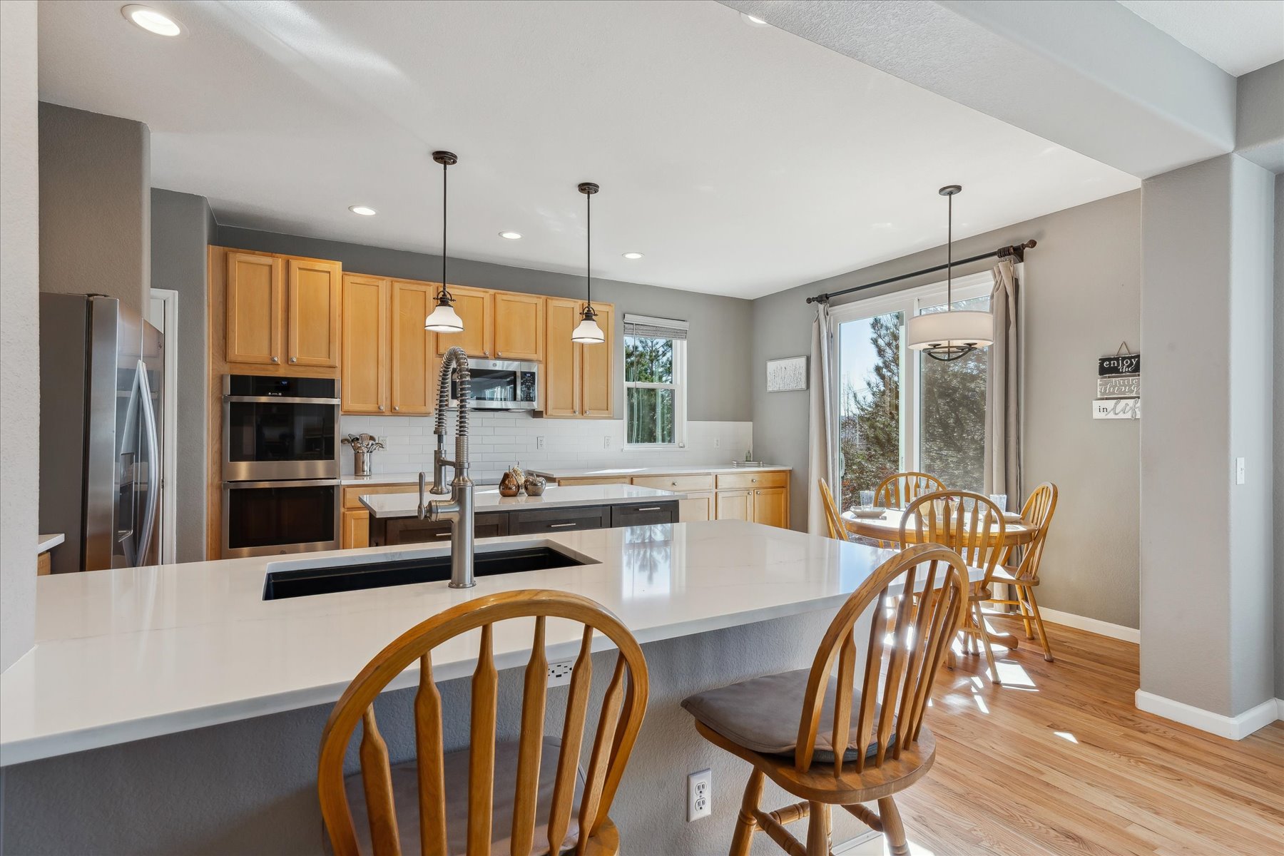 ~ Beautiful 5 Bed + 4 Bath Home in the Red Hawk Neighborhood ~ This home is in a Cul-de-sac with Easy Access to all that Castle Rock has to offer including Schools, Parks, Trails, Shopping and Entertainment ~ The foyer draws you in with tall ceilings, wood floors and french doors which open to a spacious private office ~ A formal dining room with wood floors and direct access to the kitchen is across from the grand staircase, and the house opens up into the welcoming living room and kitchen ~ A statement fireplace along one wall has a mantle and built-in shelves, while windows bring in natural light and allow views to the patio and yard ~ This space is open to the updated kitchen with room for one cook or many, all while enjoying quick access to the patio ~ The fully fenced yard wraps around the home providing lovely landscaped views from side windows and the patio is the place to dine or entertain, or to enjoy the best of Colorado weather ~ A desirable main floor primary bedroom is a quiet sanctuary with a vaulted ceiling and windows overlooking the rear of the home ~ The ensuite bathroom includes a walk-in closet, two sinks and loads of counter space and storage ~ The welcoming and airy feel of this home continues on the upper level with a total of 4 generously sized bedrooms on this floor ~ Bedrooms 2 and 3 share a full bath with dual sinks and a separate door to the tub and toilet ~ The 4th and 5th bedrooms are close to the roomy hall bath ~ Friends and family have space to spread out for fun and games in the bonus room, or maybe use it as a movie theater ~ This home has a 3-car attached garage, paid-in-full solar panels, a roomy unfinished basement for a future finish plus a crawl space for storage ~ Recent upgrades include: Exterior Paint (2025); Refinished Hard Wood Floors (2024); New Triple Pane Windows (2019), Roof (2017), Hot Water Heater (2023); New Baseboards, Trim and Solid Wood Interior Doors ~ Check out this home and set your showing today!