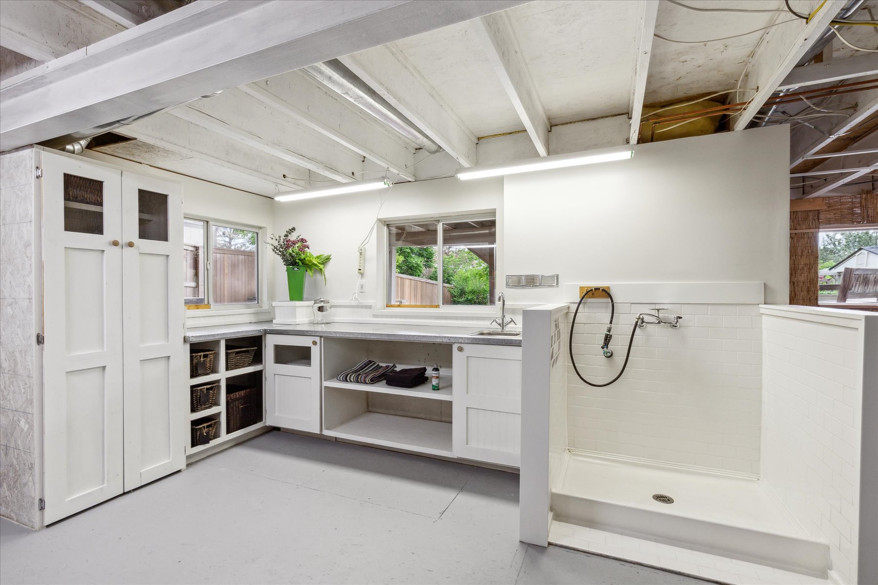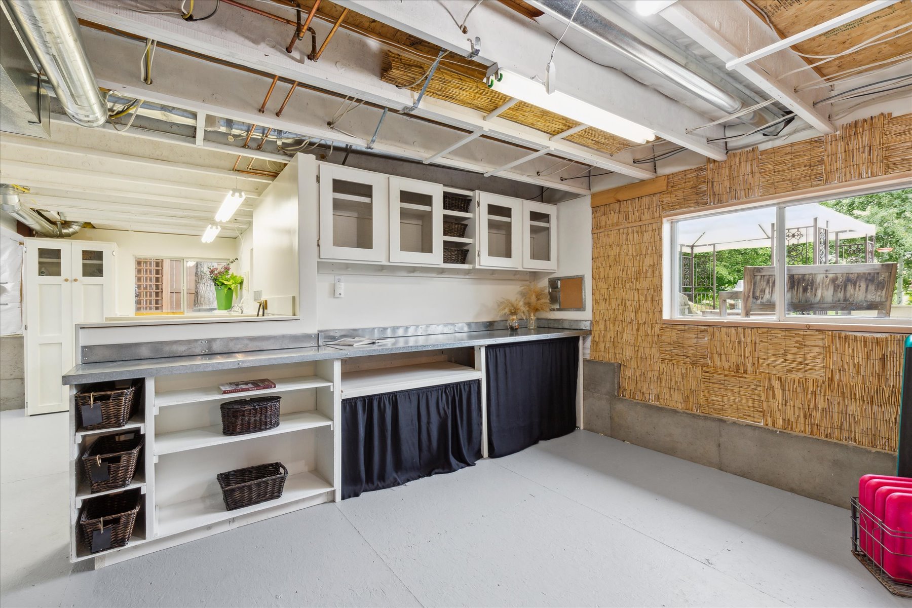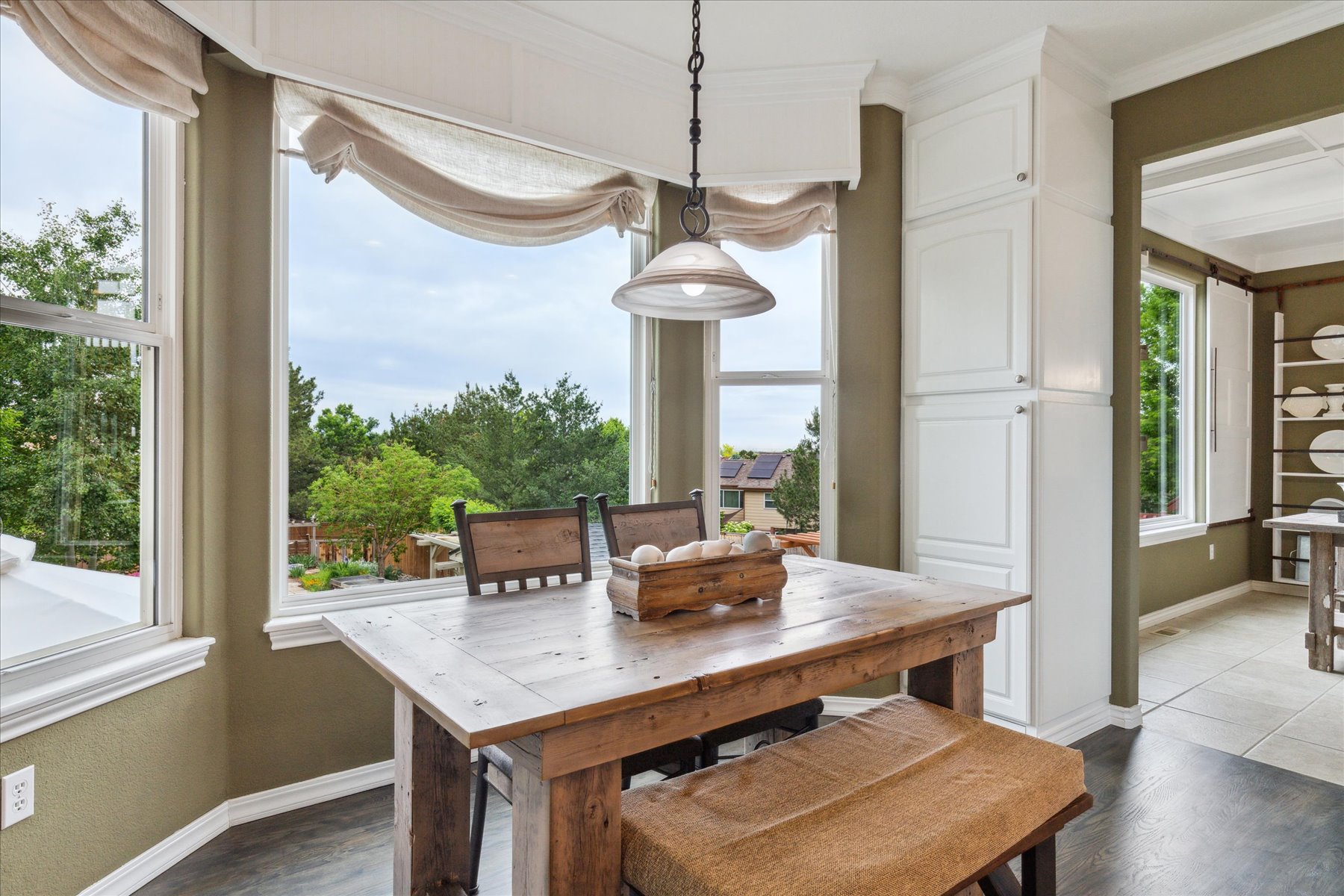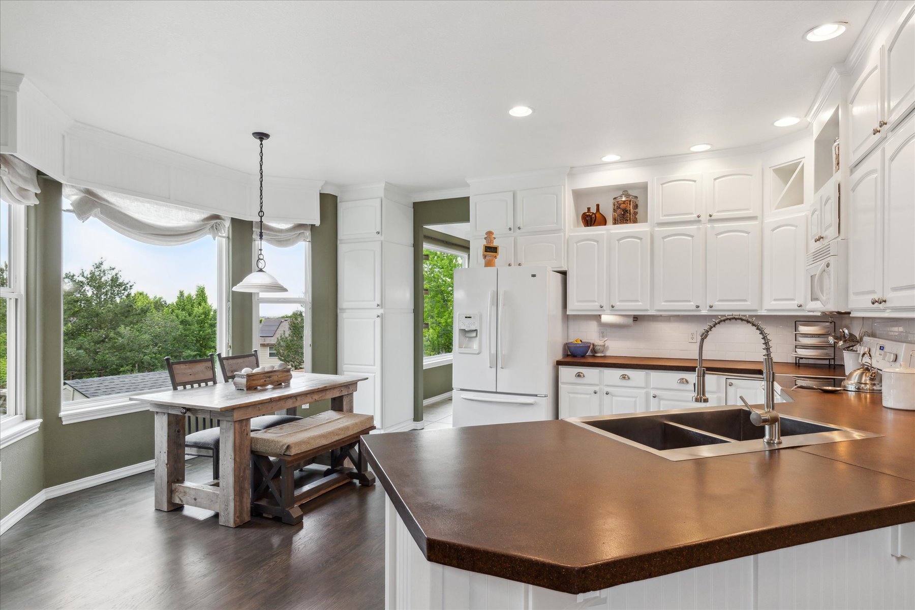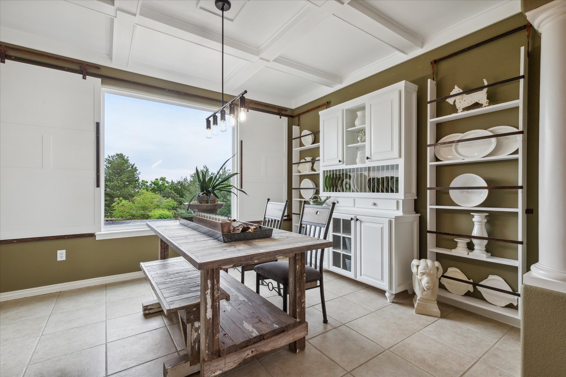 Dining Room overlooks the picturesque back yard, with views that extend to the mountains and downtown ~ This lovely room includes a coffered ceiling and custom shelving, a welcoming space to enjoy meals with friends ~ The updated, eat-in Kitchen is steps away, with access to the deck ~ Open to the Family Room, with white cabinets, custom storage touches (such as pull-outs in the pantry and toe kick drawers), newer appliances, concrete counters and a bay window, this is the room where everyone will want to gather ~ The Family Room has tall ceilings and loads of windows, as well as a gas fireplace with a stone surround and wood mantle ~ A spacious laundry room with a side porch, and an updated guest bath, complete the main floor ~ The Primary Bedroom, with its double door entry, vaulted ceiling and bay window with more views, is at the top of the stairs ~ Complete with a walk-in closet and 5-piece updated bathroom, this space is not to be missed ~ Three additional bedrooms each with double door closets and hardwood floors, and a shared full bath are close by ~ A full garden-level basement awaits whatever you can imagine, but comes equipped with a built-in dog bath, counters