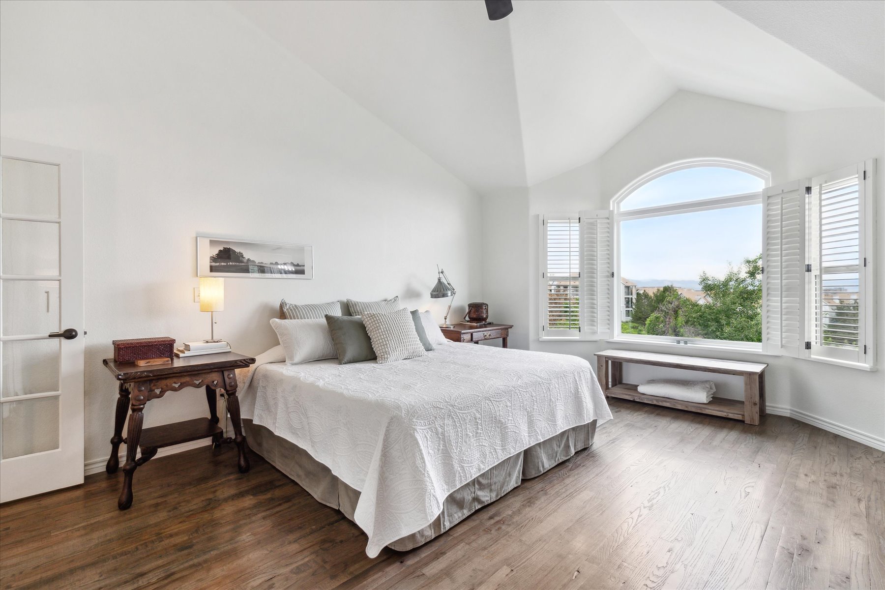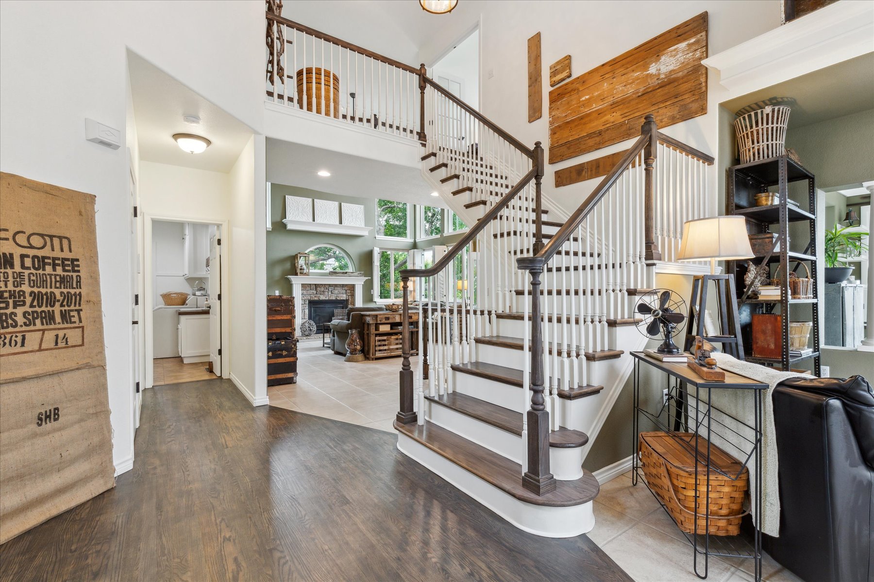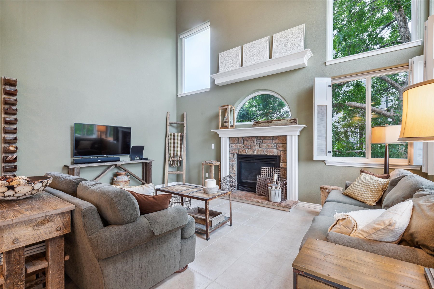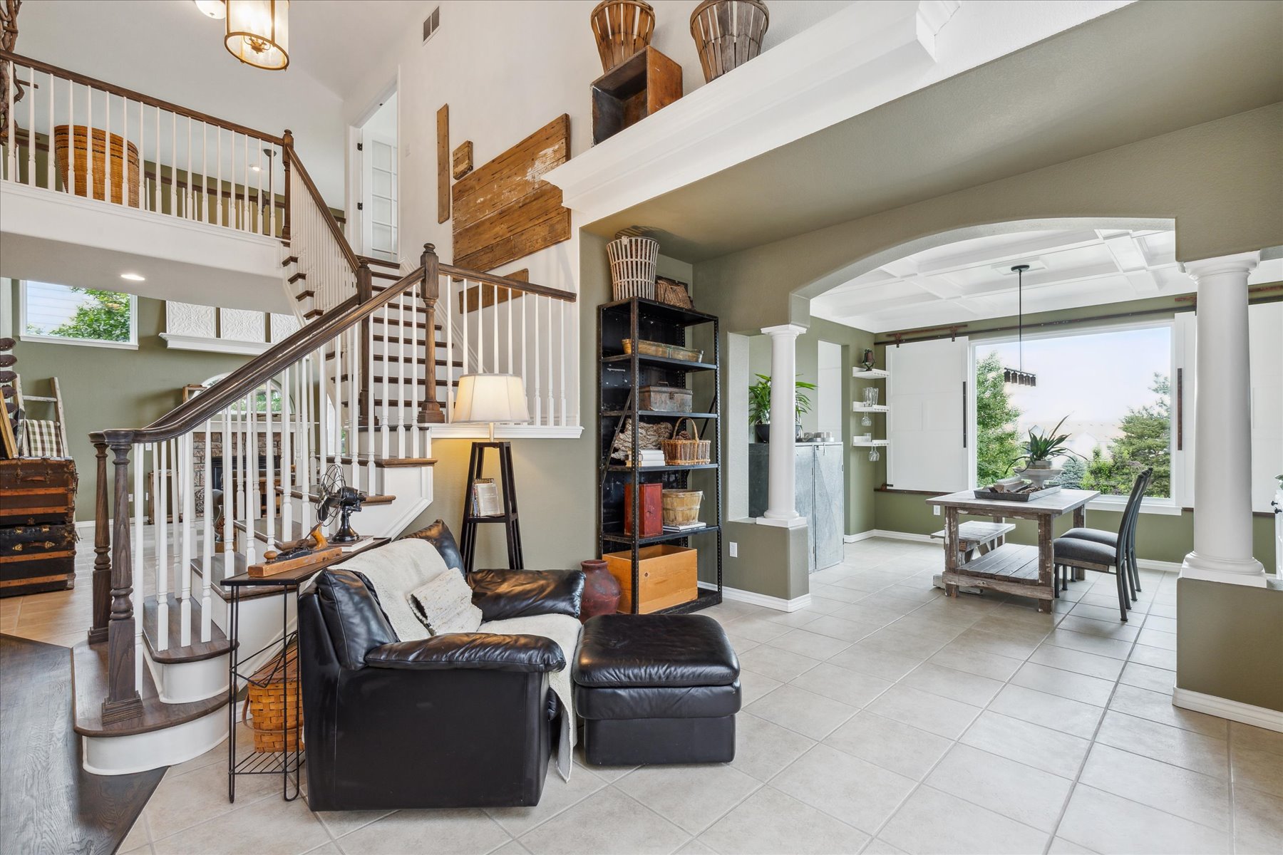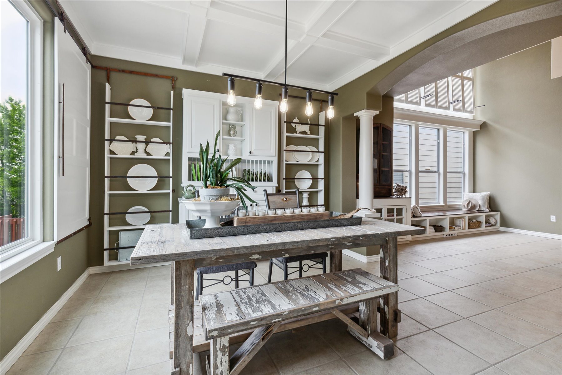 Dining Room overlooks the picturesque back yard, with views that extend to the mountains and downtown ~ This lovely room includes a coffered ceiling and custom shelving, a welcoming space to enjoy meals with friends ~ The updated, eat-in Kitchen is steps away, with access to the deck ~ Open to the Family Room, with white cabinets, custom storage touches (such as pull-outs in the pantry and toe kick drawers), newer appliances, concrete counters and a bay window, this is the room where everyone will want to gather ~ The Family Room has tall ceilings and loads of windows, as well as a gas fireplace with a stone surround and wood mantle ~ A spacious laundry room with a side porch, and an updated guest bath, complete the main floor ~ The Primary Bedroom, with its double door entry, vaulted ceiling and bay window with more views, is at the top of the stairs ~ Complete with a walk-in closet and 5-piece updated bathroom, this space is not to be missed ~ Three additional bedrooms each with double door closets and hardwood floors, and a shared full bath are close by ~ A full garden-level basement awaits whatever you can imagine, but comes equipped with a built-in dog bath, counters