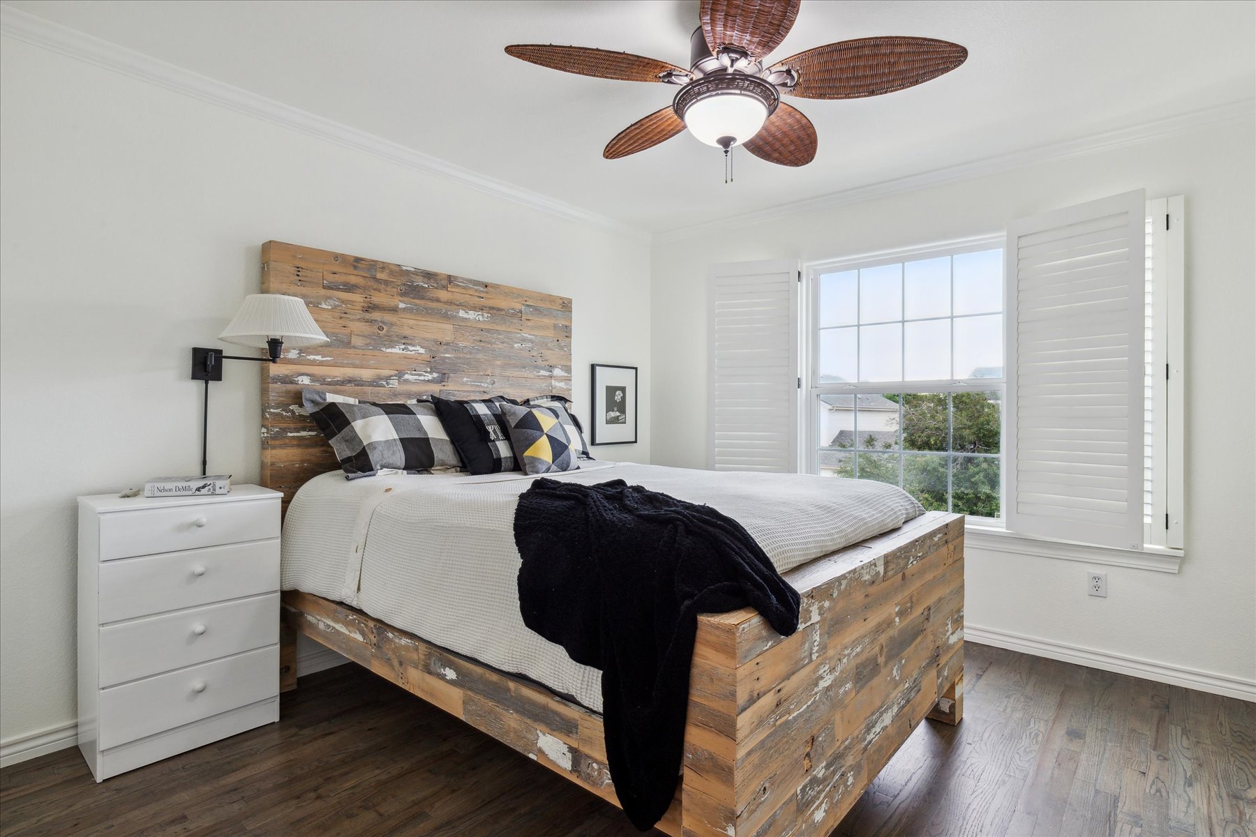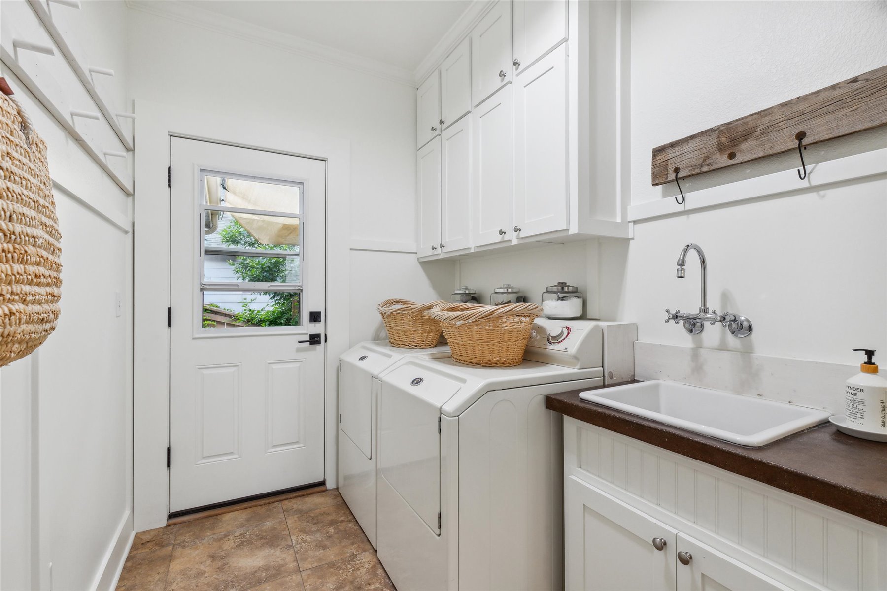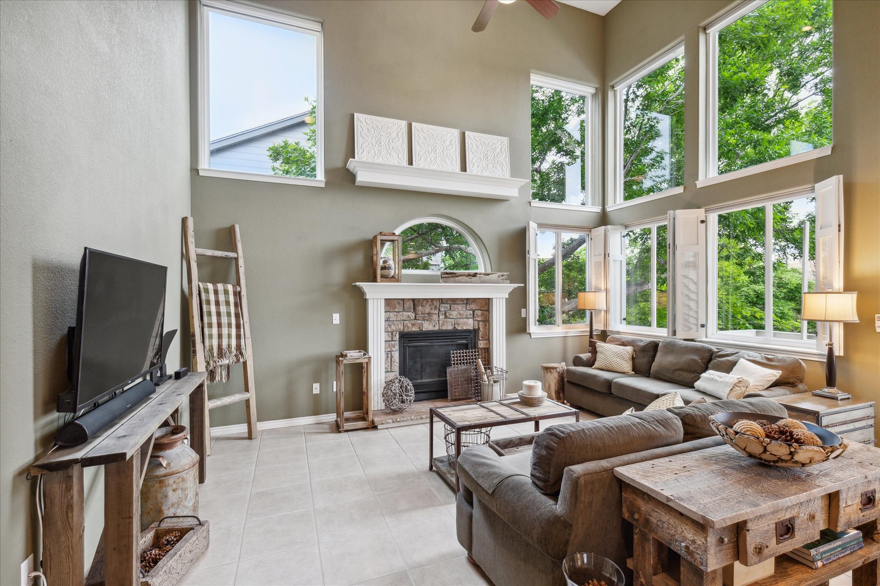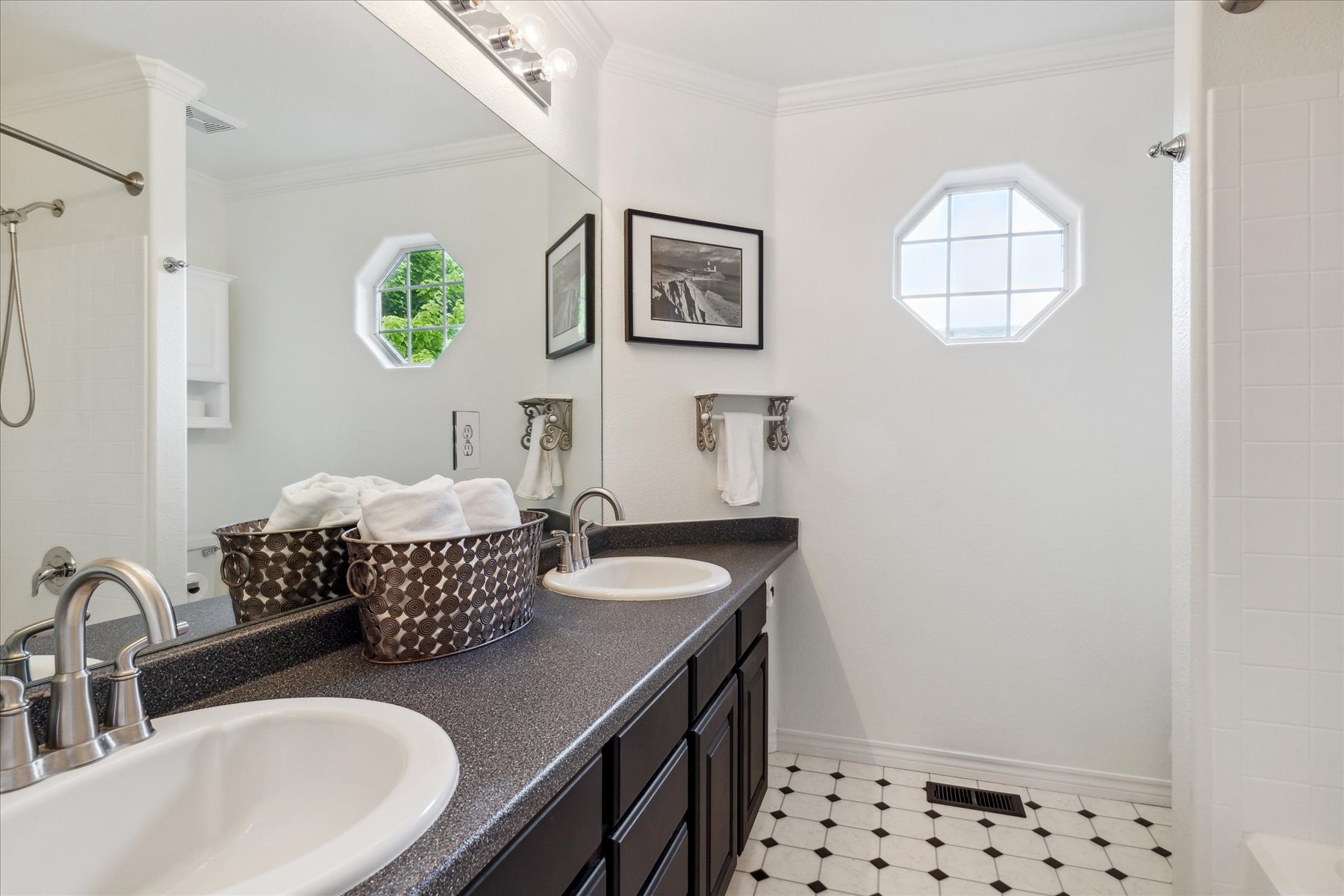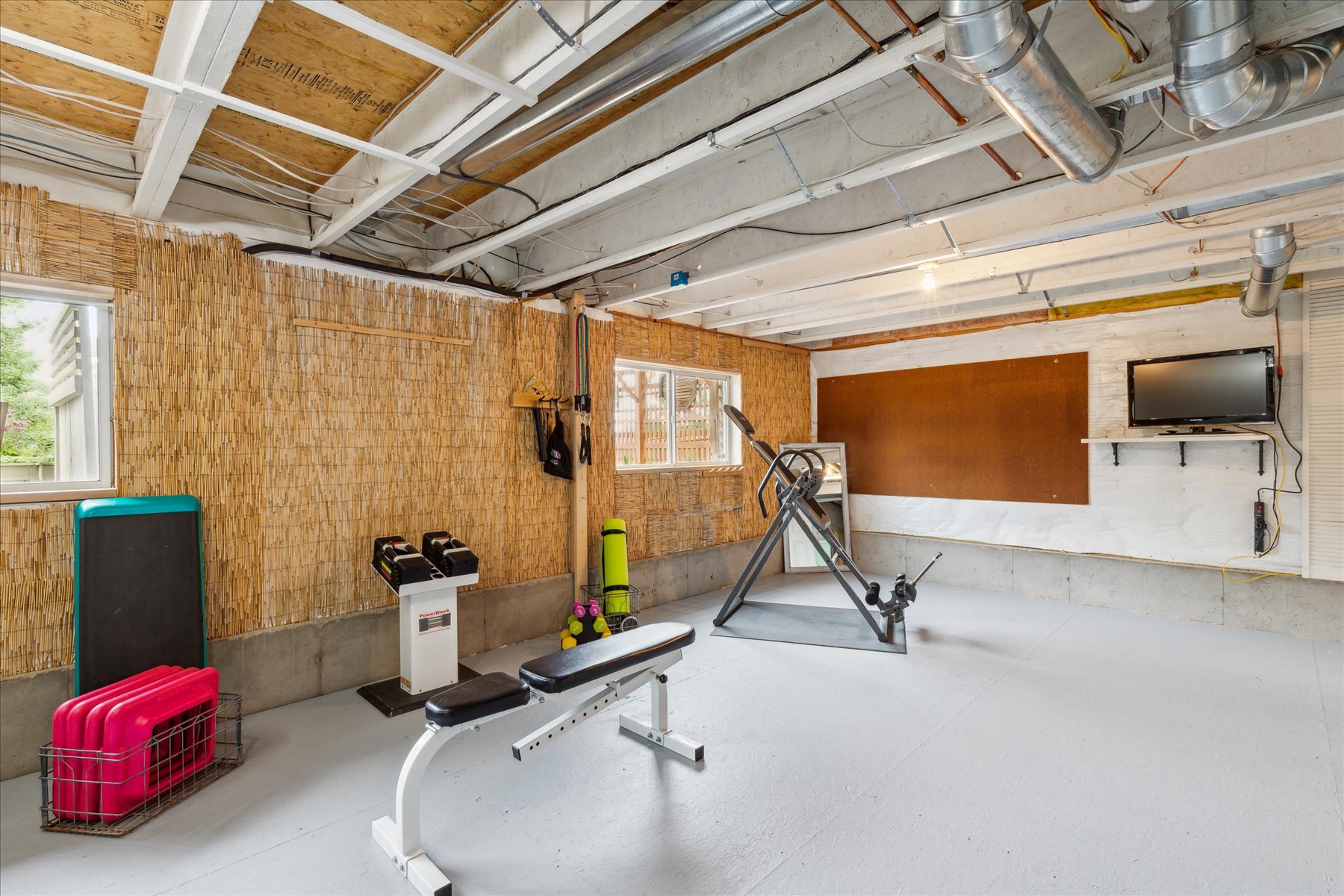 Dining Room overlooks the picturesque back yard, with views that extend to the mountains and downtown ~ This lovely room includes a coffered ceiling and custom shelving, a welcoming space to enjoy meals with friends ~ The updated, eat-in Kitchen is steps away, with access to the deck ~ Open to the Family Room, with white cabinets, custom storage touches (such as pull-outs in the pantry and toe kick drawers), newer appliances, concrete counters and a bay window, this is the room where everyone will want to gather ~ The Family Room has tall ceilings and loads of windows, as well as a gas fireplace with a stone surround and wood mantle ~ A spacious laundry room with a side porch, and an updated guest bath, complete the main floor ~ The Primary Bedroom, with its double door entry, vaulted ceiling and bay window with more views, is at the top of the stairs ~ Complete with a walk-in closet and 5-piece updated bathroom, this space is not to be missed ~ Three additional bedrooms each with double door closets and hardwood floors, and a shared full bath are close by ~ A full garden-level basement awaits whatever you can imagine, but comes equipped with a built-in dog bath, counters