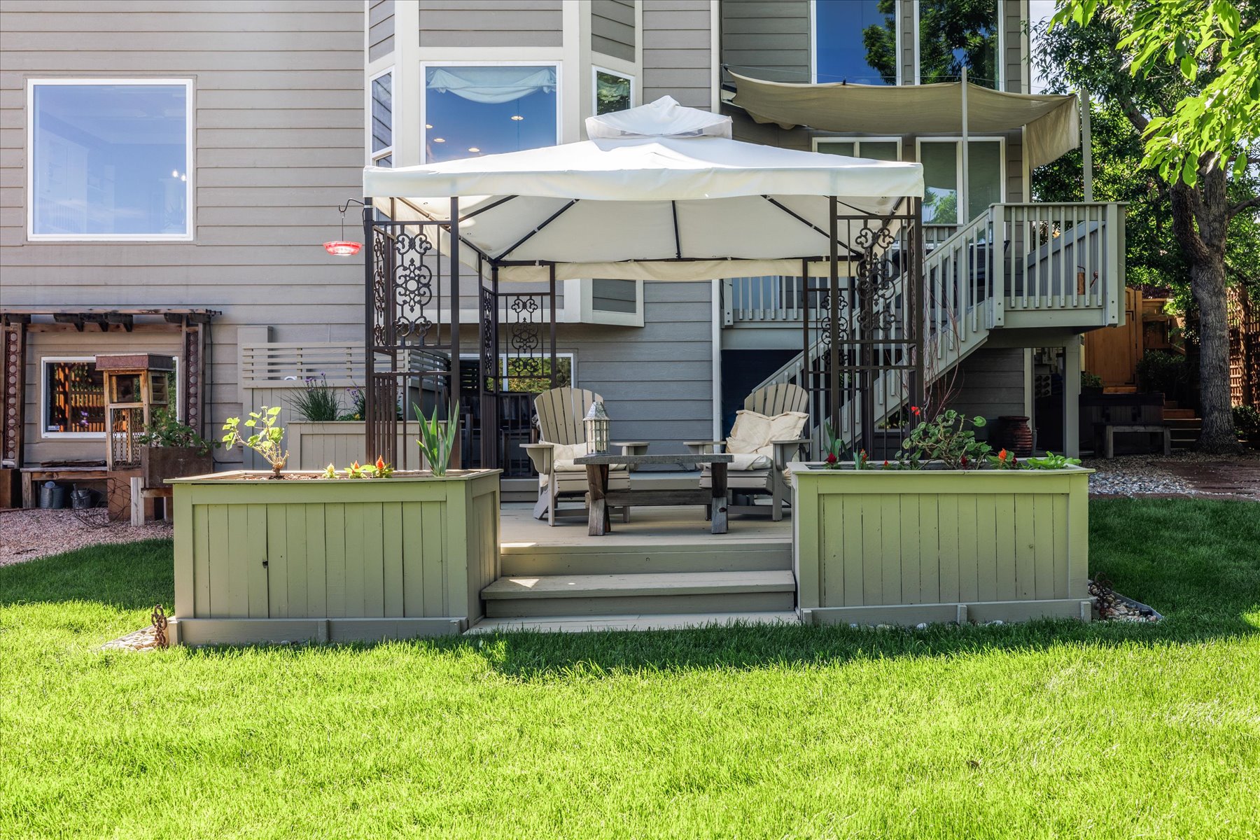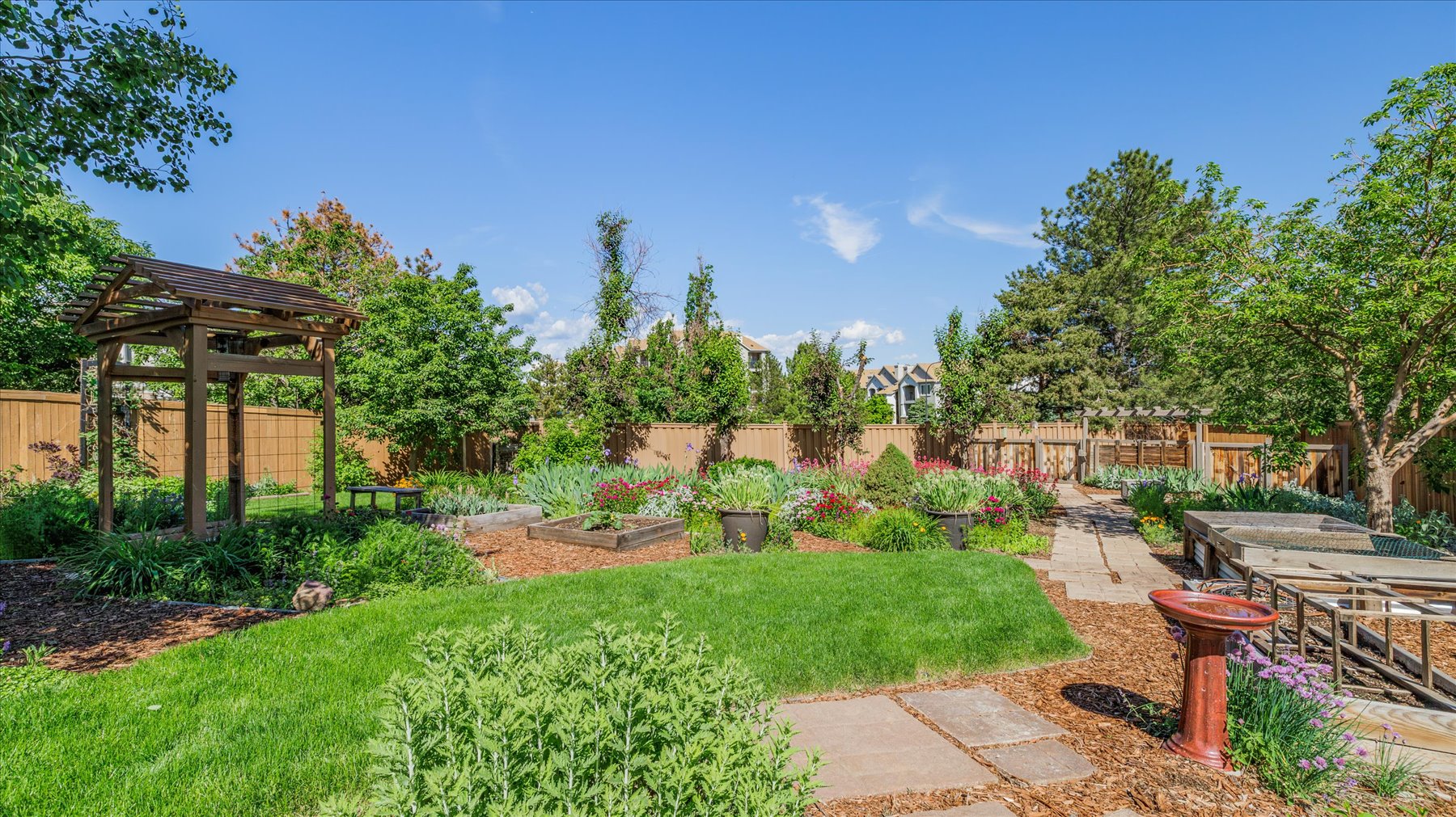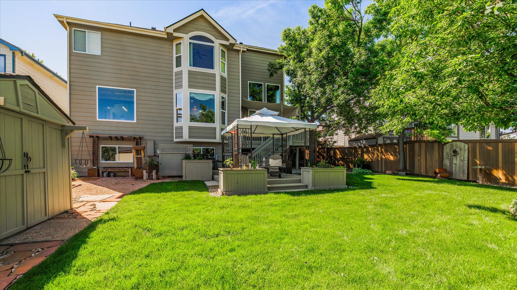 and cabinets ~ The fully fenced Back Yard is your private oasis, complete with flowering beds, sculpted lawns, raised beds for gardening, gazebo, garden shed, and even a hot tub, this is the yard of your dreams!!