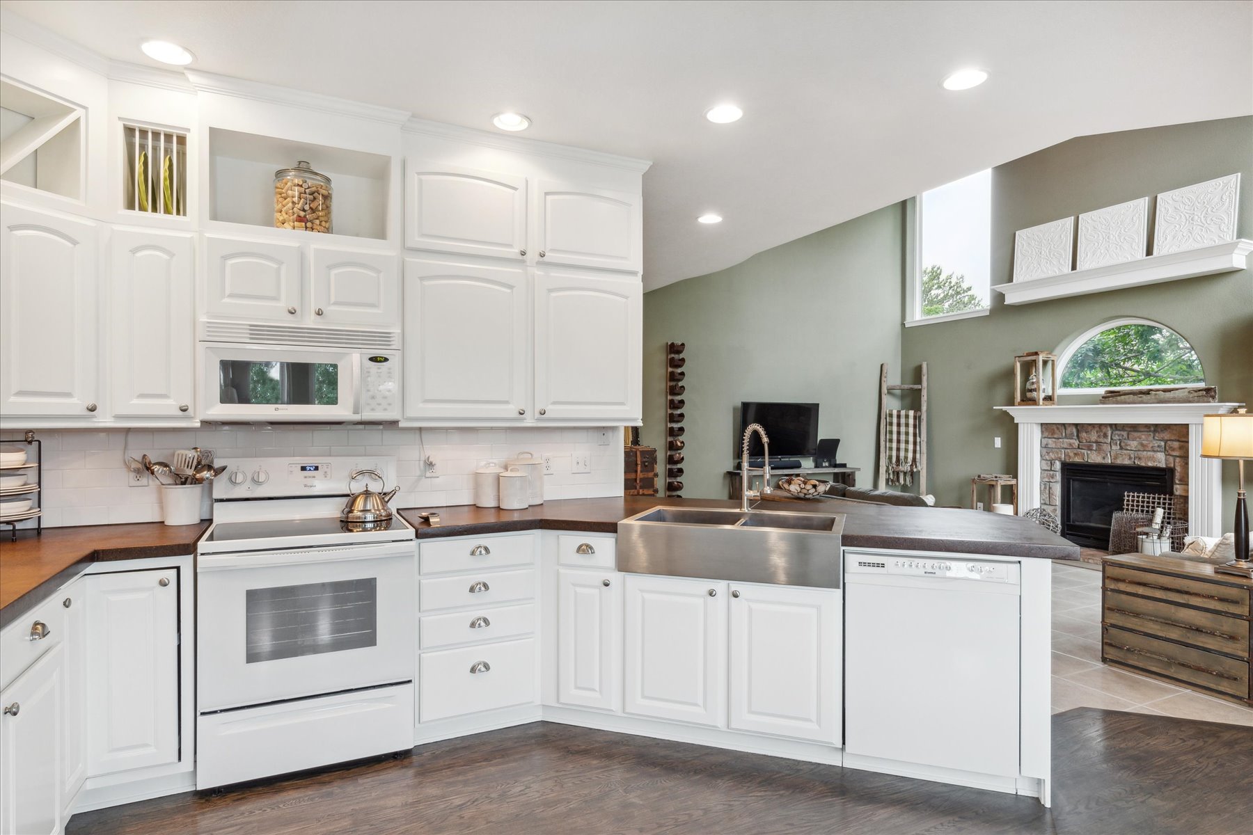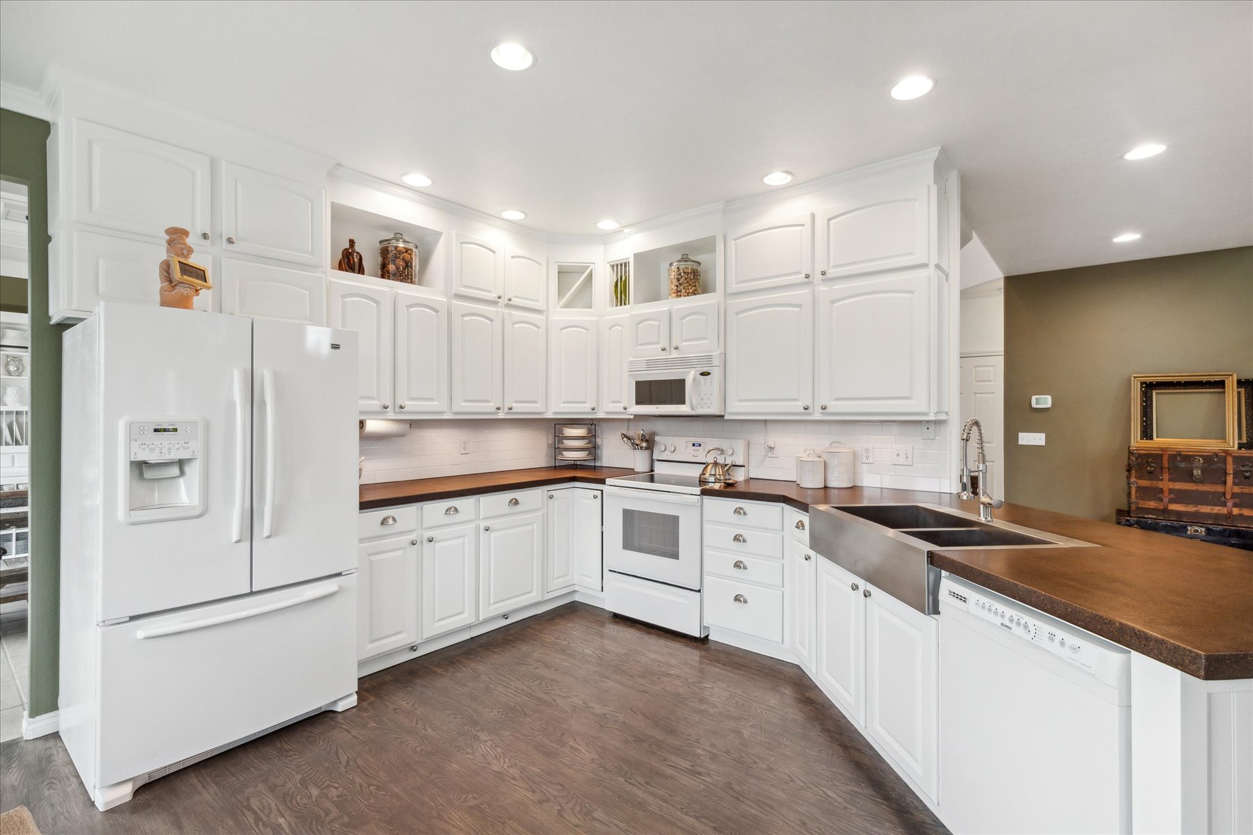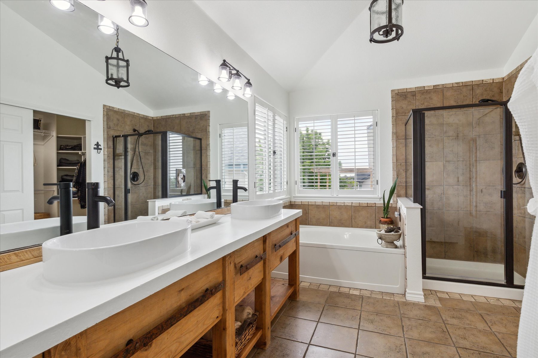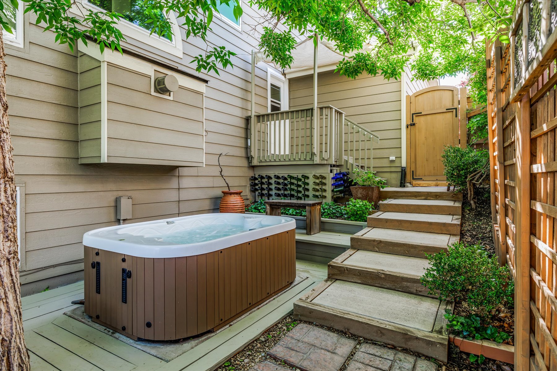 and cabinets ~ The fully fenced Back Yard is your private oasis, complete with flowering beds, sculpted lawns, raised beds for gardening, gazebo, garden shed, and even a hot tub, this is the yard of your dreams!!