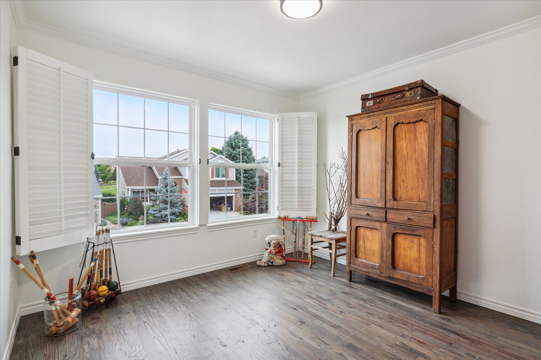 Picture Perfect Property from Curb to Fence - Sellers have lovingly and creatively updated both the home and landscaping ~ This 4 Bed + 3 Bath home is in the heart of Highlands Ranch and close to shopping, parks, trails and schools, just minutes to Town Center and C470 ~ This home has light paint throughout, no carpet, updated flooring and thoughtful decor ~ A private Office is to the immediate right of the entry, with custom built-ins and a bay window for a perfect work environment ~ The Living Room is open, with plenty of natural light and a built-in window seat ~ A picture window in the