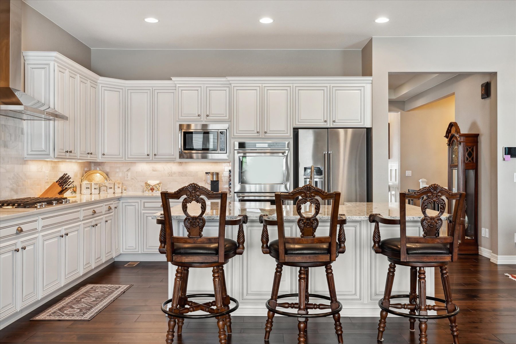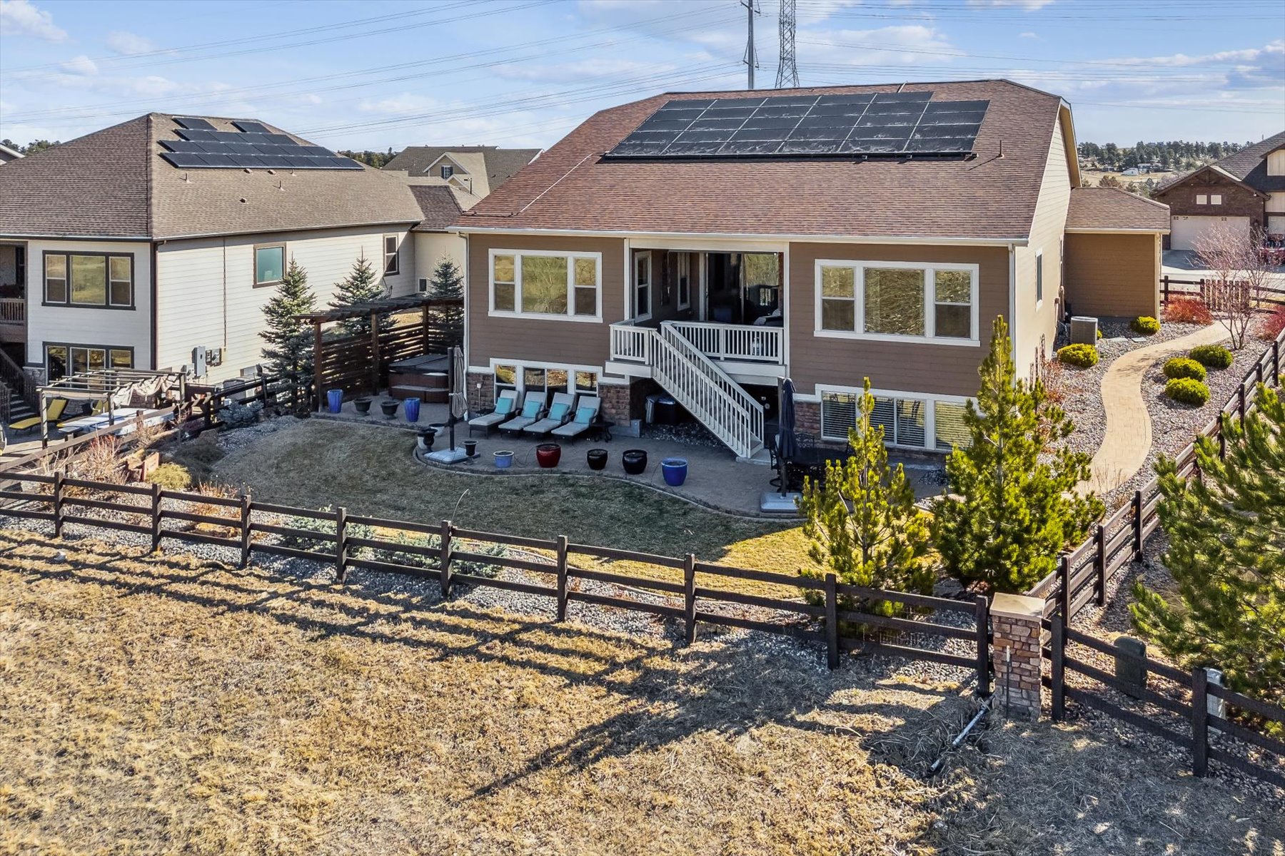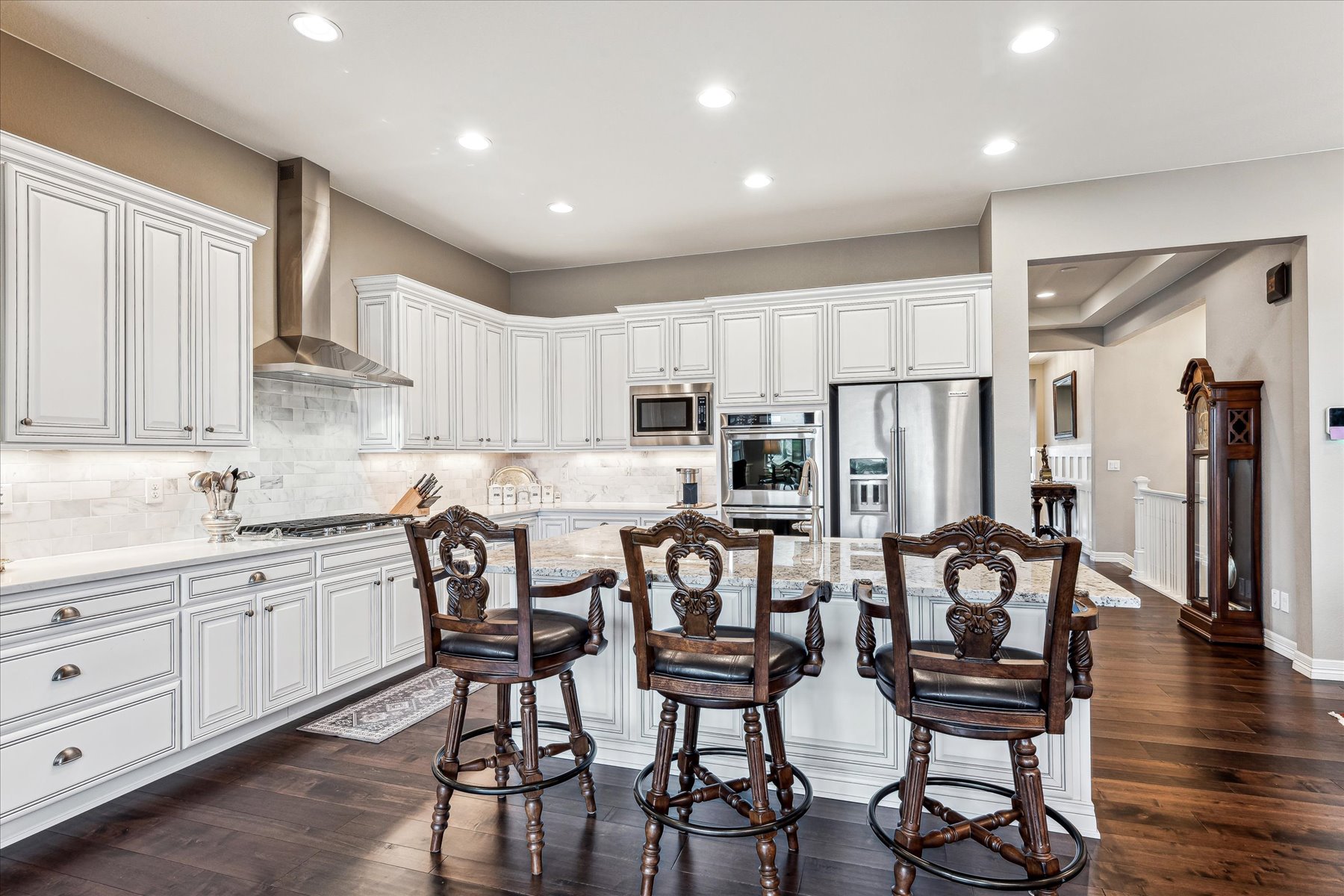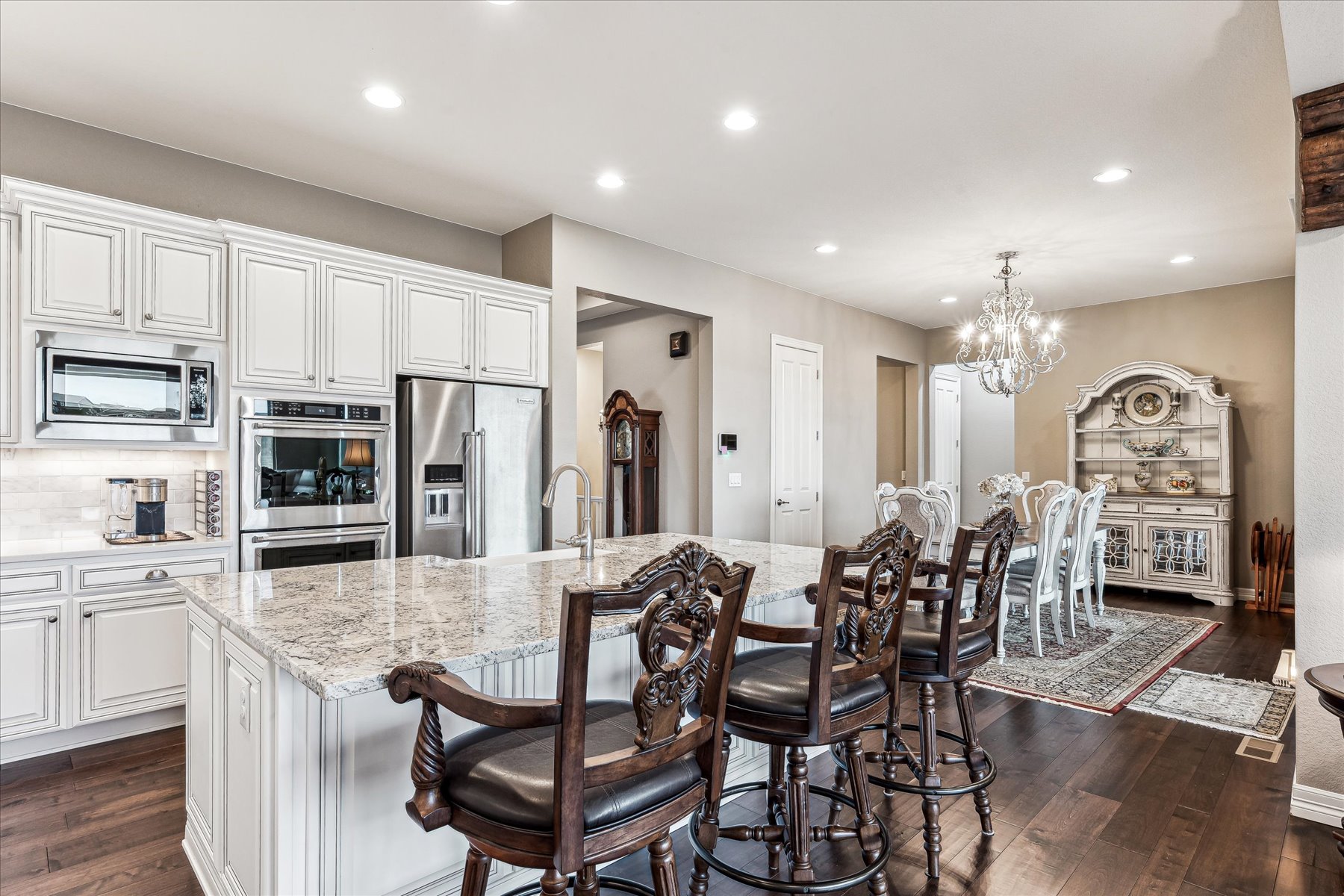 ~ AMAZING OPPORTUNITY on this Stunning 5 Bedroom + 5 Bath Home that has been Impeccably Designed and Maintained ~ From the Front Door to the Views, this home feels like a Model Home with High End Finishes throughout, including Wood Floors, Hunter Douglas Sheer Shades, Quartz Counters, Solid Wood Interior Doors, Upgraded Appliances, Fixtures and Lighting ~ The foyer rises to meet guests at the door with 10 ft ceilings, crown molding and wainscot detailing ~ A cozy bedroom with an attached full bath is tucked to the side, followed by the elegant powder bath, and a roomy office ~ Follow the hall past the open staircase, complete with chandelier, and the grand formal dining room, to the welcoming heart of the home ~ The well-appointed kitchen has everything a chef could need with a walk-in pantry, 2 wall ovens, 5-burner gas range with vent hood and plenty of cabinet & counter space ~ The island is the place to prep - open to the living room, informal dining room and with easy access to the covered deck ~ The openness of the space ensures the cook will never miss the party ~ The living & dining rooms are just the right size for large groups or intimate gatherings ~ The deck has been carefully designed for maximum enjoyment of the amazing views, through most of year, cozy up to the gas fireplace on chilly evenings, or enjoy shady relaxing on hot days ~ A short flight of stairs leads to the patio and professionally landscaped yard, complete with hot tub ~ The primary suite is an oasis, welcoming and private ~ The walk-in closet is accessible through the 5-piece bathroom, which is equipped with a soaking tub, walk-in shower and dual vanities ~ Another secondary bedroom, with its own bath, and the laundry room are complete this level ~ Take the stairs to the enormous basement with plenty of light from the garden level windows, and plenty of space for all ~ There are 2 additional bedrooms, plus the wet bar, a bonus room and another bath ~ See this one today, set a showing!