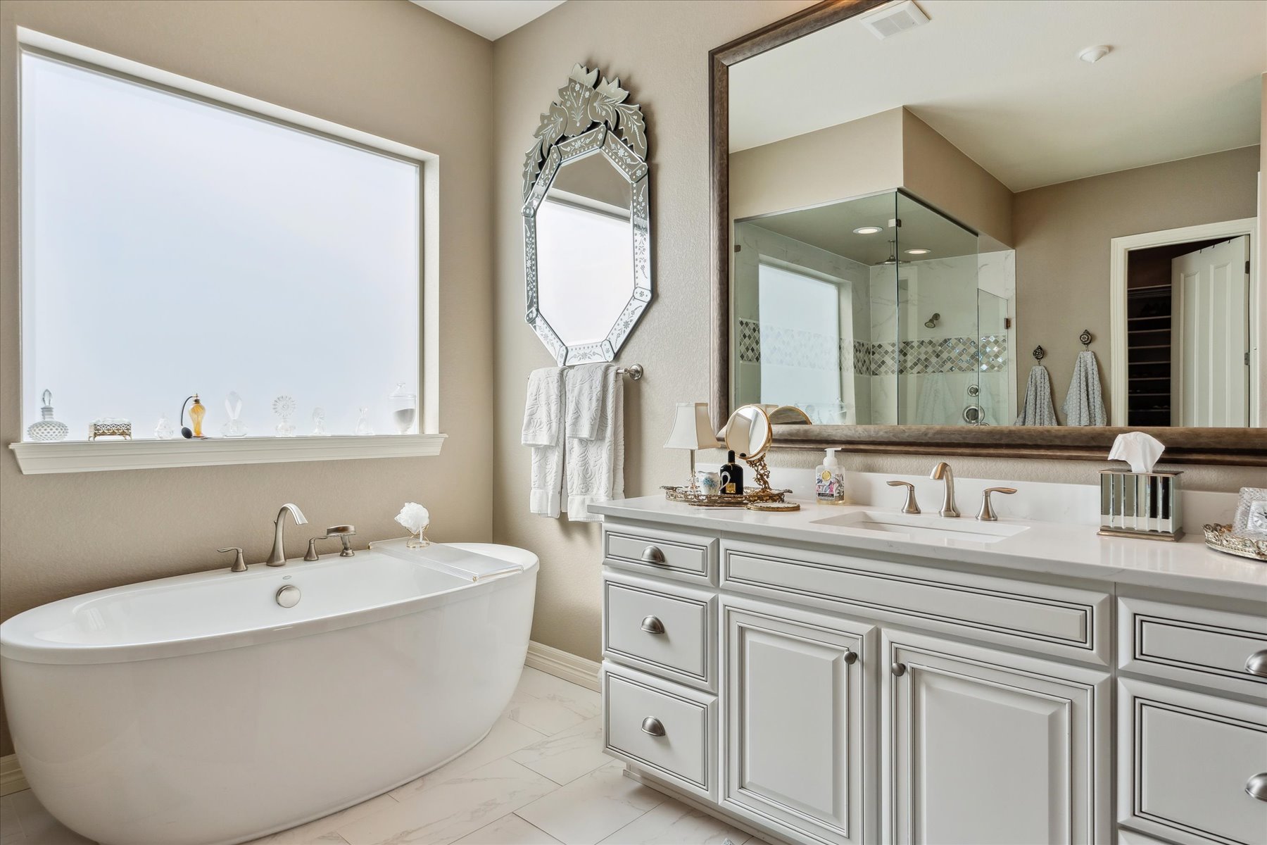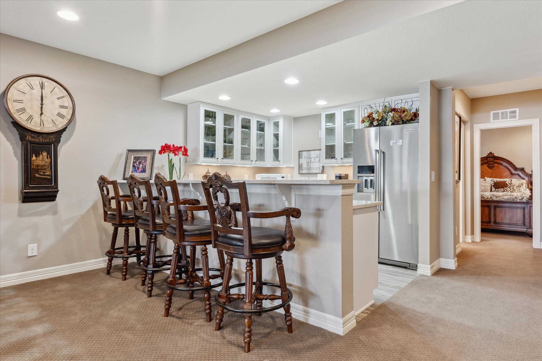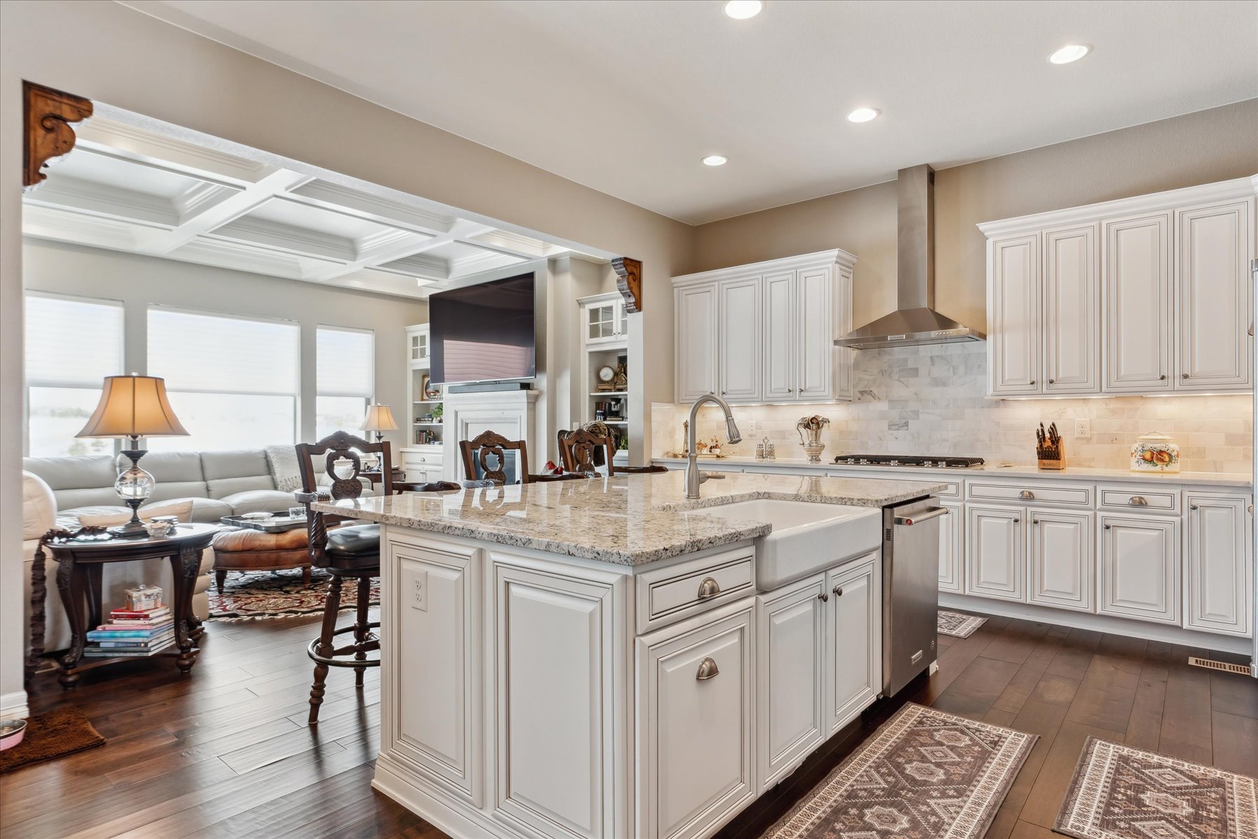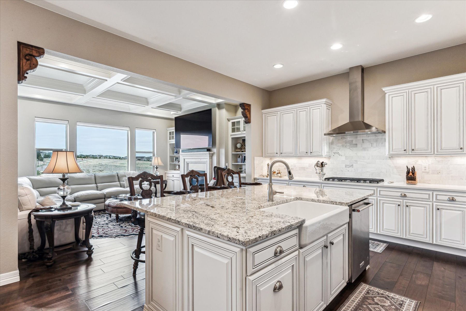 ~ AMAZING OPPORTUNITY on this Stunning 5 Bedroom + 5 Bath Home that has been Impeccably Designed and Maintained ~ From the Front Door to the Views, this home feels like a Model Home with High End Finishes throughout, including Wood Floors, Hunter Douglas Sheer Shades, Quartz Counters, Solid Wood Interior Doors, Upgraded Appliances, Fixtures and Lighting ~ The foyer rises to meet guests at the door with 10 ft ceilings, crown molding and wainscot detailing ~ A cozy bedroom with an attached full bath is tucked to the side, followed by the elegant powder bath, and a roomy office ~ Follow the hall past the open staircase, complete with chandelier, and the grand formal dining room, to the welcoming heart of the home ~ The well-appointed kitchen has everything a chef could need with a walk-in pantry, 2 wall ovens, 5-burner gas range with vent hood and plenty of cabinet & counter space ~ The island is the place to prep - open to the living room, informal dining room and with easy access to the covered deck ~ The openness of the space ensures the cook will never miss the party ~ The living & dining rooms are just the right size for large groups or intimate gatherings ~ The deck has been carefully designed for maximum enjoyment of the amazing views, through most of year, cozy up to the gas fireplace on chilly evenings, or enjoy shady relaxing on hot days ~ A short flight of stairs leads to the patio and professionally landscaped yard, complete with hot tub ~ The primary suite is an oasis, welcoming and private ~ The walk-in closet is accessible through the 5-piece bathroom, which is equipped with a soaking tub, walk-in shower and dual vanities ~ Another secondary bedroom, with its own bath, and the laundry room are complete this level ~ Take the stairs to the enormous basement with plenty of light from the garden level windows, and plenty of space for all ~ There are 2 additional bedrooms, plus the wet bar, a bonus room and another bath ~ See this one today, set a showing!